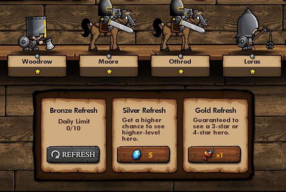 Gold Refresh 를 하기 위해서는 Gold Goblets 라는 아이템이 필요한데 스테이지에서 별 30개를 모두 채우거나 해서 퀘스트로 얻는 방법과 보석 80개를 주고 구하는 방법이 있습니다. Gold Refresh가 좋은 점은 별3개 또는 별4개 등급의 영웅을 보장한다는 것입니다. 하지만 비싼 Gold Refresh 를 주고 새로고침을 했는데도 별4개 영웅이 아닌 별3개 영웅이 나오면... 눈물이 앞을 가립니다.