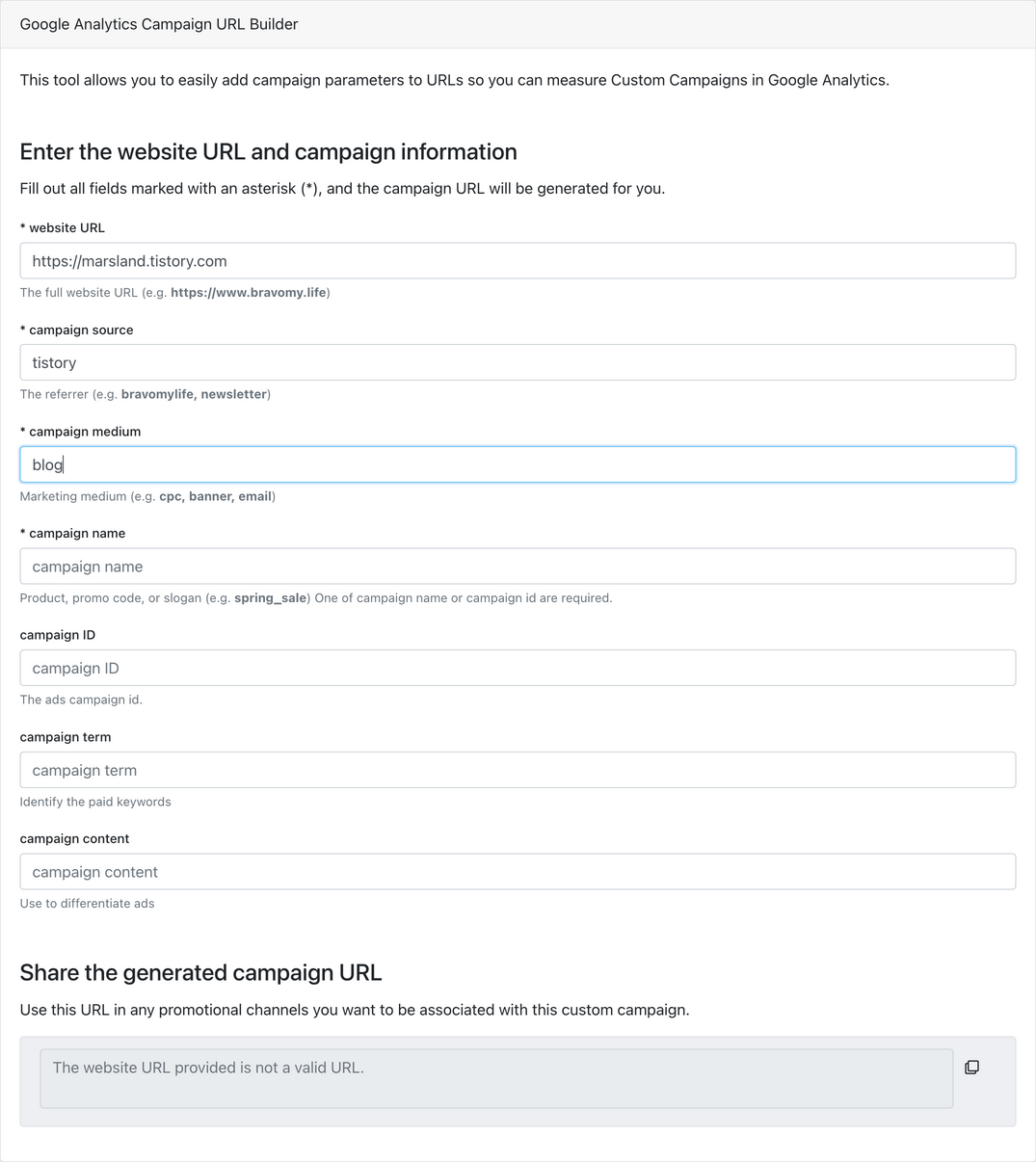 * 붙은 필수값을 다 입력하시면 아래에 url이 완성되어서 표시가 되는데, 이걸 복사해서 원하시는 곳에 활용하시면 됩니다.
