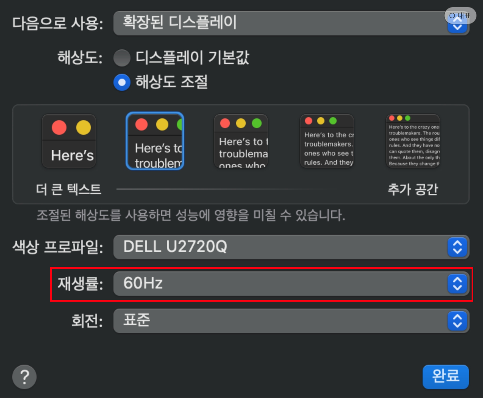 저의 경우에는 이렇게 환경설정 - 디스플레이 - 디스플레이 설정 - 재생률을 29.5Hz에서 60Hz로 변경함으로써 제가 겪고 있던 마우스 버벅거림 현상을 해결하였습니다.