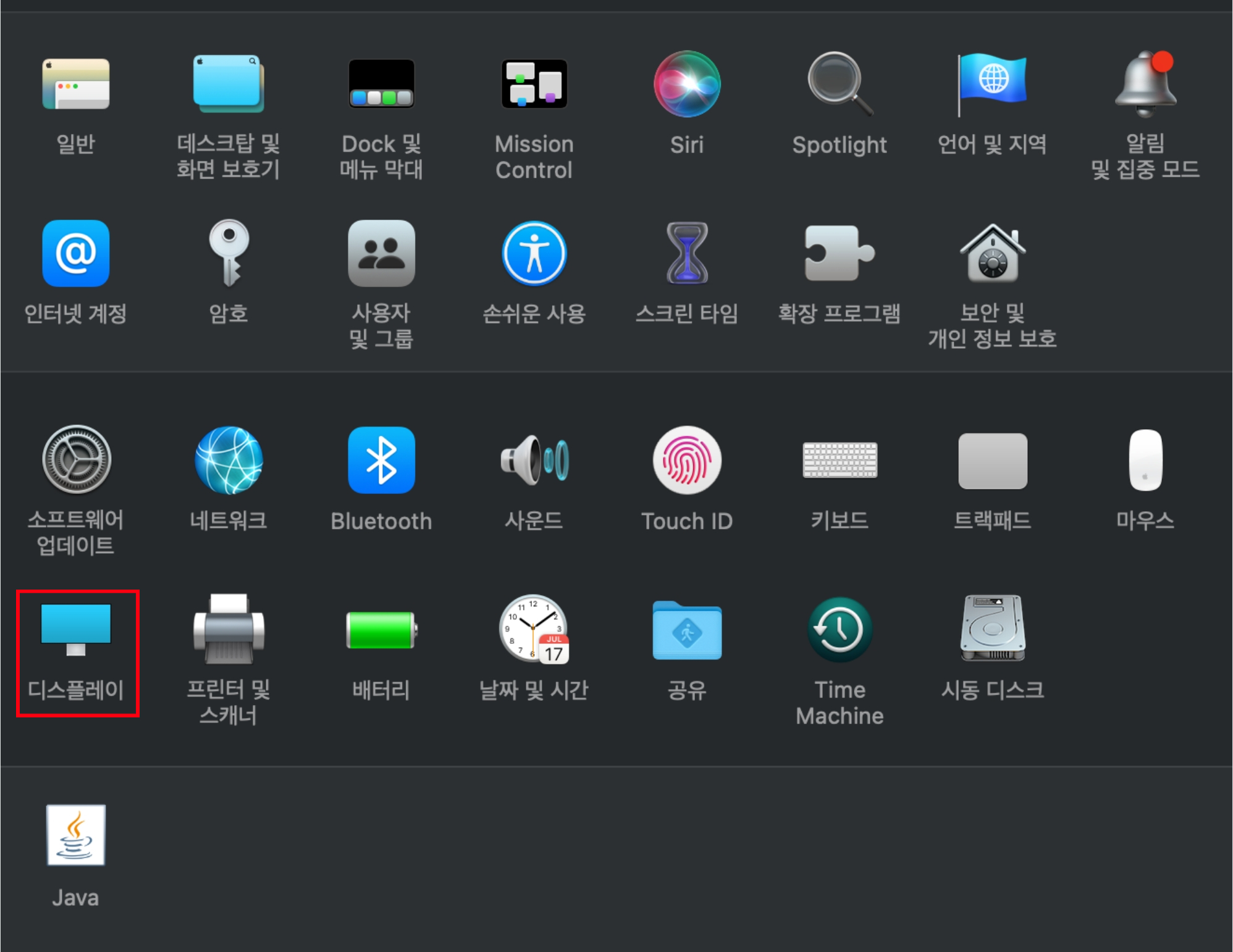 일단 맥북에 모니터 2대를 연결해서 사용하고 있으며, 맥북은 덮어 놓고 쓰지 않습니다. 혹시 몰라서 이리저리 설정을 건드려보다가 디스플레이에서 해답을 찾게 되었습니다.